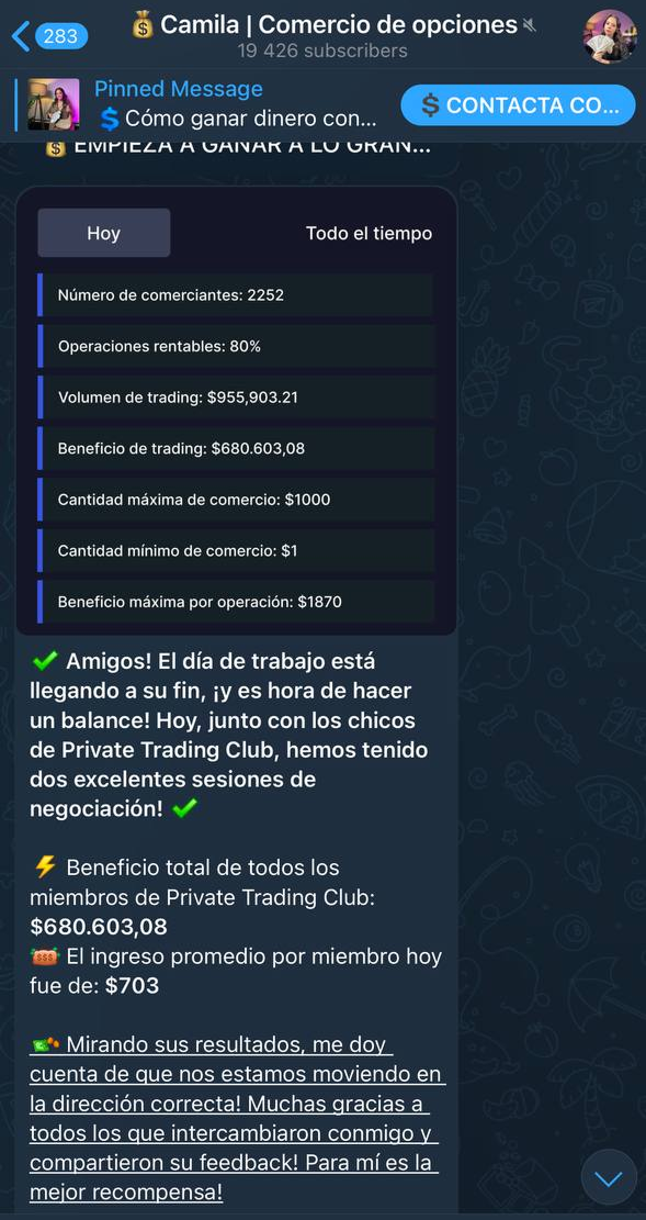 Durante la transmisión, Carlos mostró cómo, utilizando señales del Club de Telegram de Camila, aumentó el saldo de la presentadora en $1860 en solo una hora.